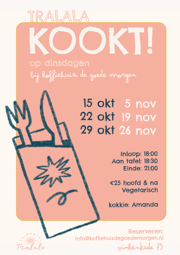 We ruilen de circustent op Tuinhotel Tralala voor de herfst en winter in voor ‘t Koffiehuis en zetten de diners voort op de dinsdag. Onze geweldige kok Amanda kookt samen met Tania de lekkerste gerechten, terwijl jullie bijkletsen onder het genot van heerlijke drankjes. Kom gezellig mee eten! Alle data is te vinden op onderstaande poster.