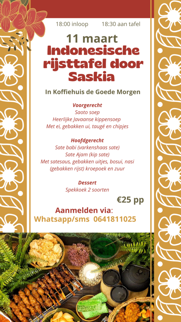 Aanschuifdiner: Saskia Kookt! Aanschuifdiner: Saskia Kookt! Vind plaats op 21 januari, 6:00 pm Koffiehuis de Goede Morgen