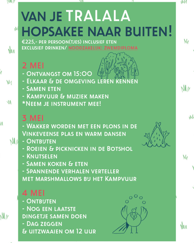 8:30 uur: Samen de dag beginnen met een frisse duik in de plas (onder begeleiding van Marielle van Zwemclub de Goede Morgen) 9:30 uur: Proef het Tralala ontbijtje voor een tientje (doe eens gek en ga doordeweeks uit ontbijten) 10:00 uur: Super speciale bij-eenkomst met Henri onze imker (kom alles te weten over het bijenvolk wat bij Tralala woont)