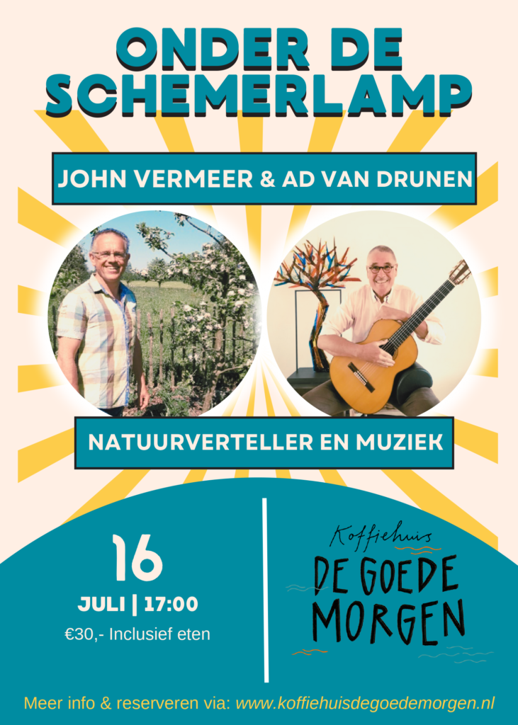 Tijd: 17:00 tot +- 20:00 €30,- inclusief 2 mooie optredens en heerlijk avondeten (exclusief drankjes) Reserveer via: info@koffiehuisdegoedemorgen.nl